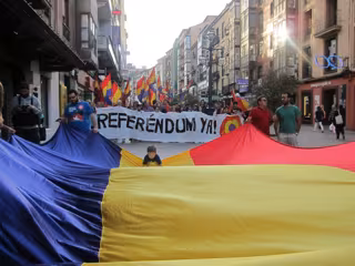 Esta movilización, que ha salido de la plaza de Numancia y ha culminado en el Ayuntamiento de Santander, ha estado encabezada por la pancarta 'Referéndum Ya' y una bandera republicana gigante que han portado representantes de las diferentes organizaciones convocantes.