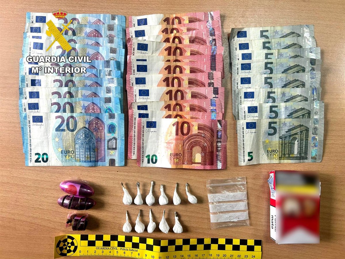 En su interior se hallaron 11 bolsitas de cocaína y hachís dividido en ocho trozos, todo ello preparado para su distribución al menudeo. Además, al hombre que llevaba la cajetilla de tabaco se le intervino dinero en billetes de 20, 10 y 5 euros, que la Guardia Civil no descarta que procediera de venta de estupefacientes.