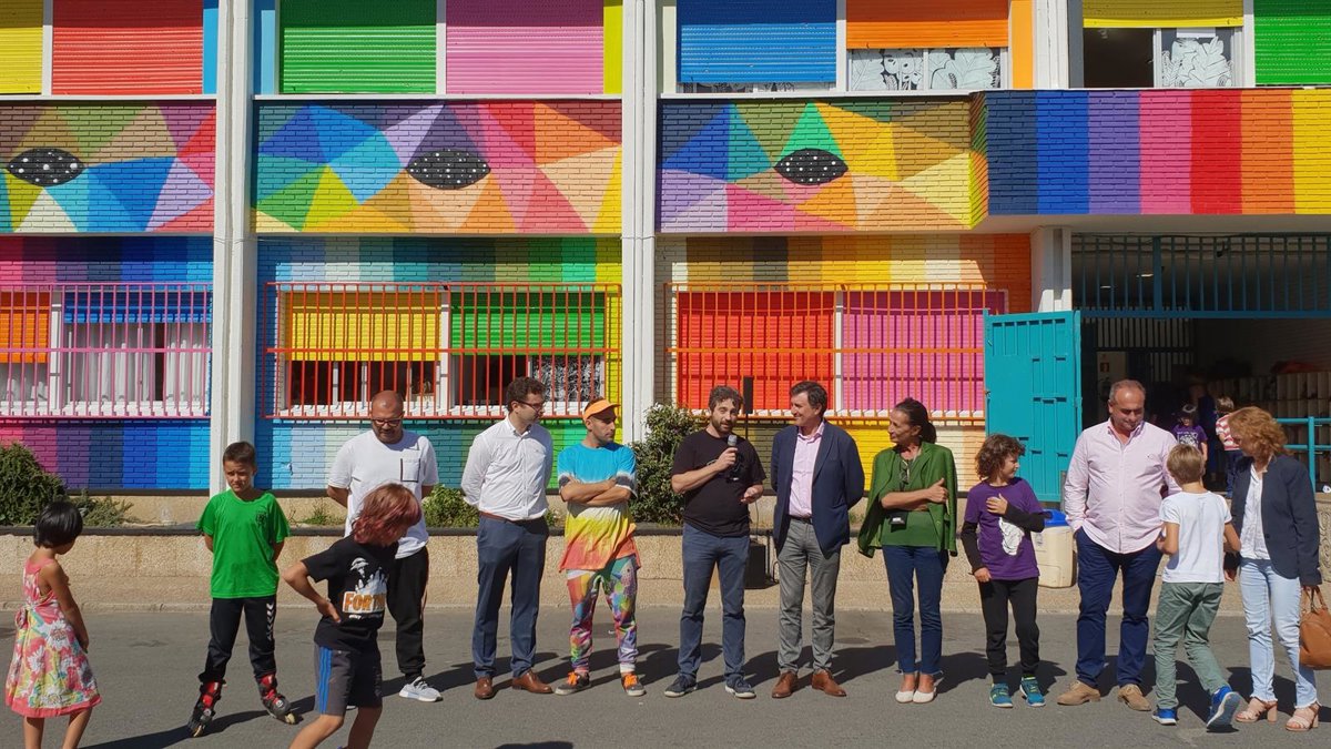 Así, el colegio Vital Alsar luce desde hoy un mural con las famosas imágenes poliédricas que caracterizan la obra del artista cántabro. Esta campaña de micromecenazgo se organizó a través de la plataforma 'Ulule' y ha recibido aportaciones incluso desde Alemania, Francia o Estados Unidos, entre otros países.