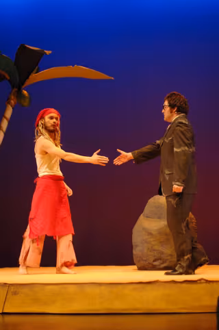 En 'La Isla', esta compañía parte de la idea de que el cocinero se había creado un mundo "mágico" para no volverse loco. Habla con las palmeras, tiene una cocina imaginaria donde "practica sus recetas", con ingredientes que solo él ve, tiene su equipo de sonido que no existe, etc. Todos estos recursos que tienen sentido en una situación real como esta, dotan al montaje de un sentido muy teatral y lleva a la metáfora.