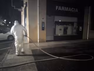 Efectivos del plan de limpieza y desinfección trabajan en el exterior de una farmacia - GOBIERNO