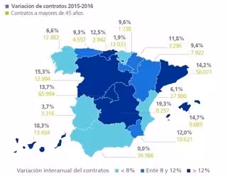 Otro de los datos que muestra este informe es que todas las regiones, a excepción de Andalucía, han incrementado el número de contratos indefinidos a mayores de 45 años en 2016 con respecto al año anterior, aunque con matices.