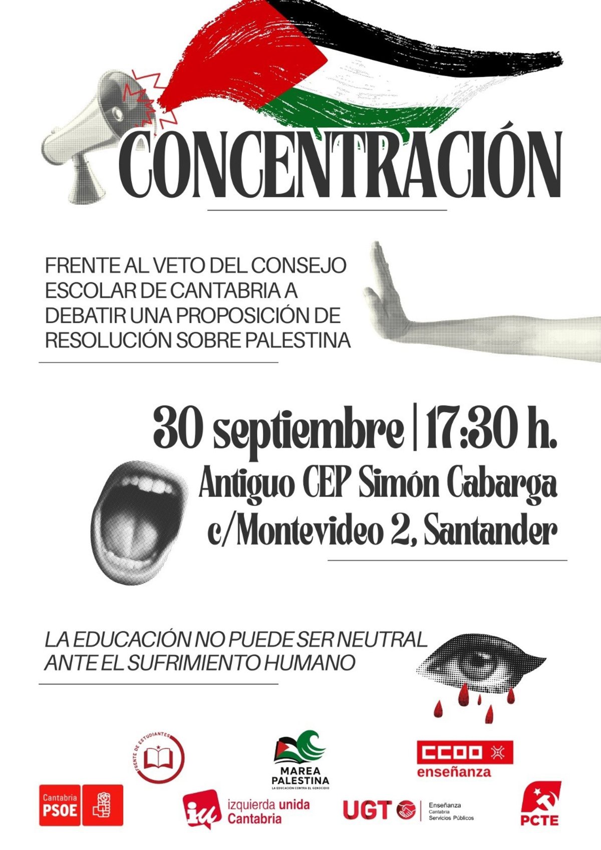 CCOO, UGT, Marea Palestina, PSOE, IU, PCTE y Frente de Estudiantes han convocado este martes, 30 de septiembre, una concentración para protestar por el "veto" del Consejo Escolar de Cantabria de la semana pasada a debatir una resolución sobre Palestina promovida por la Federación de Enseñanza de CCOO en Cantabria.