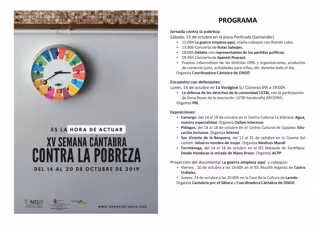 La Coordinadora Cántabra de Organizaciones No Gubernamentales de Desarrollo (ONGD) celebra del 14 al 20 de octubre de 2019 la Semana Cántabra contra la Pobreza, que este año alcanza su decimoquinta edición bajo el lema 'Es la hora de actuar'.