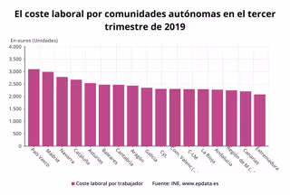 El coste laboral de Cantabria se situó 81,04 euros por debajo del medio nacional (2.553,62 euros) y se mantuvo en el séptimo puesto como más alto por comunidades, que en el tercer trimestre del año encabezó el País Vasco con 3.101,6 euros.