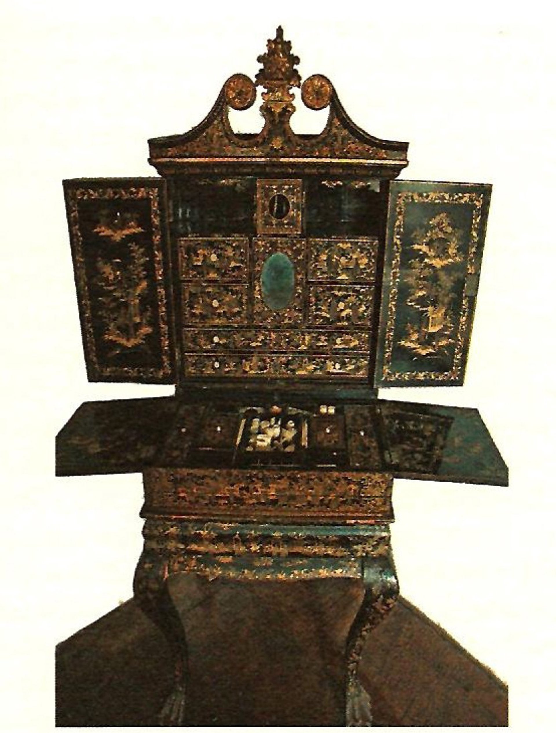 El mueble presenta una cajonera, rematada por un frontón partido, y una mesa de trabajo que encajan independientemente sobre una base de cuatro patas. La cajonera posee compartimentos de diferente tamaño que incluyen un espejo y un reloj (hoy desaparecido), además de un cajón secreto en el lateral derecho de la base.
