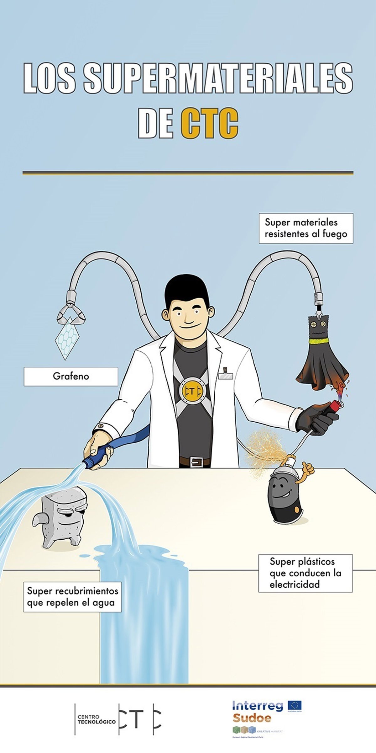 El diseño de CTC muestra una viñeta en la que aparece un investigador capaz de convertir materiales convencionales en super-materiales, gracias a sus investigaciones en nanotecnología.