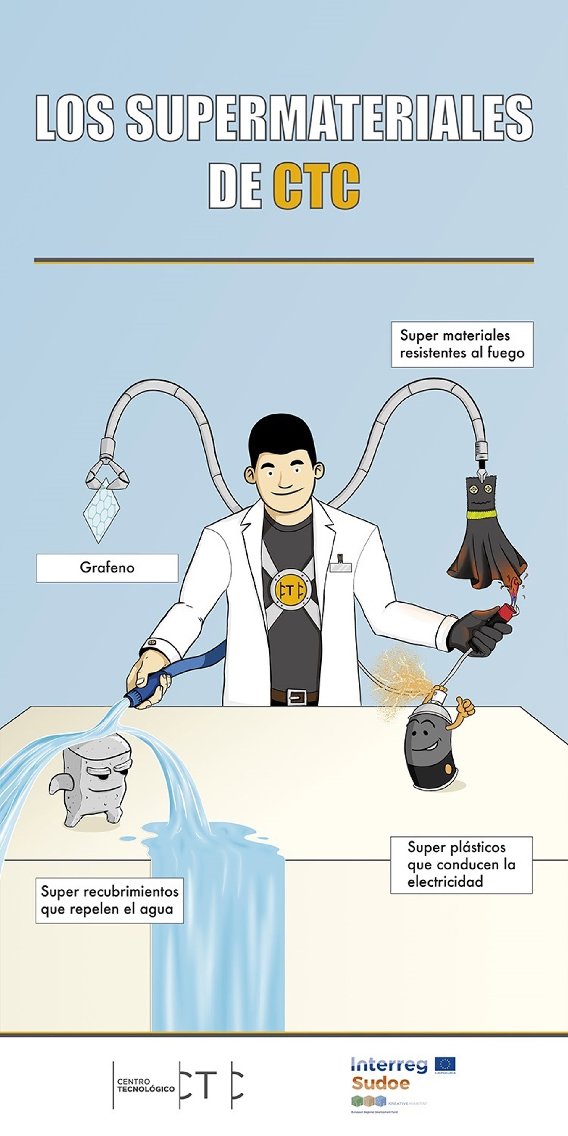 La imagen formará del stand que el Centro Tecnológico tendrá durante la iniciativa 'Dialoga con la ciencia, dialoga con un científico', correspondiente a la Noche Europea de los Investigadores. Además del súper científico, el equipo de CTC exhibirá alguno de estos súper materiales y un vídeo en el que se podrá observar cómo funcionan los materiales con propiedades hidrofóbicas.