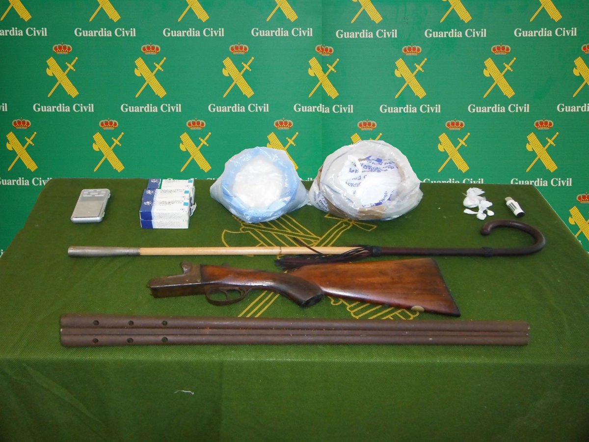 Posteriormente fueron localizados y detenidos los dos que habían huido por la ventana. A uno se le intervino una escopeta inutilizada y al otro una cachaba tipo bastón con la que se supone que agredió en la cabeza a otro de los detenidos.