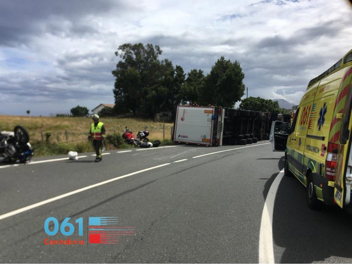 Cuatro personas, tres varones y una mujer de 54 años, han resultado heridos tras volcar un camión y colisionar dos motos en las que viabajan tres personas en la carretera nacional N-634 a su paso por Ontón.