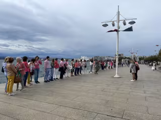 Medio centenar de mujeres han formado este jueves una cadena humana en la Bahía de Santander, junto a Los Raqueros, que lucen un lazo rosa, con motivo del Día Internacional de lucha contra el Cáncer de mama, que se conmemora este 19 de octubre.