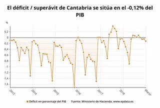 El déficit de Cantabria se ha situado en 17 millones de euros hasta marzo, lo que supone un 0,12 por ciento del PIB de la Comunidad, el mismo que hace un año, según los datos hechos públicos este martes por el Ministerio de Hacienda.