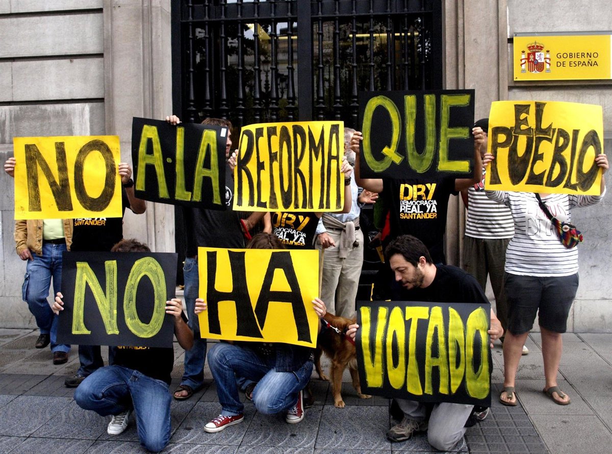 Un grupo de integrantes de Democracia Real Ya se ha concentrado este domingo en Santander frente a la Delegación del Gobierno para mostrar su rechazo a una reforma constitucional que "no la ha votado el pueblo" y que ha sido pactada "en 48 horas" por PSOE y PP.