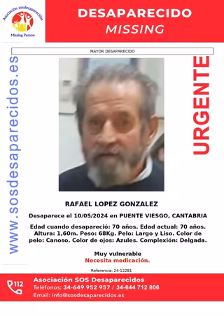 "Las horas corren y cuantos más medios técnicos y humanos se puedan sumar a la búsqueda, más posibilidades hay de encontrar a Rafael", ha apuntado la Asociación SOS Desaparecidos en su cuenta de X (antes Twitter).