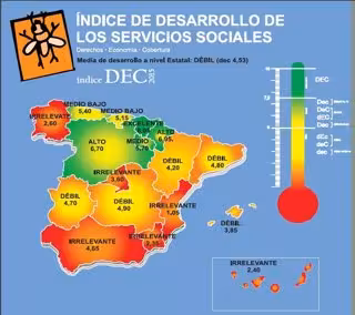 El Índice evalúa el grado de desarrollo en derechos y decisión política, relevancia económica y nivel de cobertura de servicios (DEC) con una puntuación de 0 a 10 que para 2015, se salda con la media de un suspenso: Entre todas las comunidades autónomas obtienen un 4,5, un 4,2 si se observa la mediana, cota que no supera la mayor parte de las autonomías.