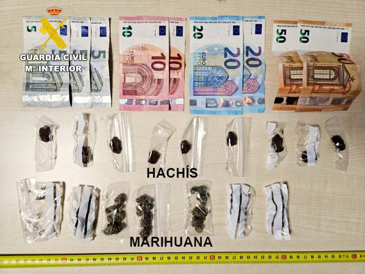 En el registro de su bolso, los agentes encontraron 9 envoltorios con diferentes cantidades de hachís y otros 7 con marihuana, que, por su forma de dosificación, se presume que estaban preparados para su venta al menudeo. También llevaba billetes de 50, 20, 10 y 5 euros, que se sospecha sean fruto de ventas ya realizadas.