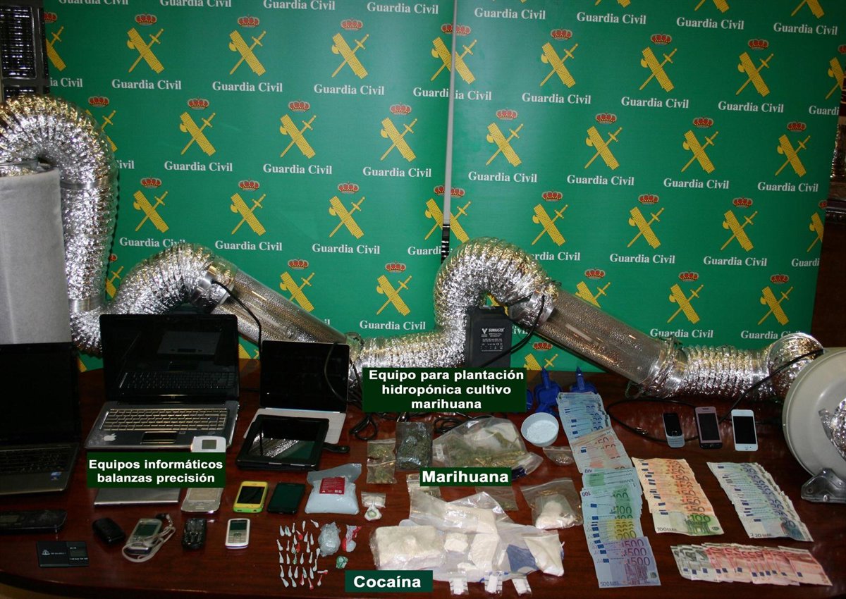 De las intervenciones y los seis registros se han intervenido casi un kilo de cocaína del que se podía haber obtenido unas 10.000 dosis de esta sustancia, pequeñas cantidades de marihuana y hachís, 4 balanzas de precisión, 10 teléfonos móviles, equipos informáticos, más de 12.000 euros en metálico, un equipo completo para plantación hidropónica de marihuana, tres vehículos de alta gama, así como diferentes efectos para la dosificación de los estupefacientes.