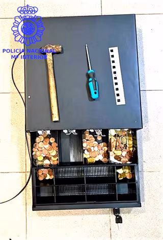 Caja registradora robada de una librería y herramientas usadas para romper el cristal - POLICÍA NACIONAL
