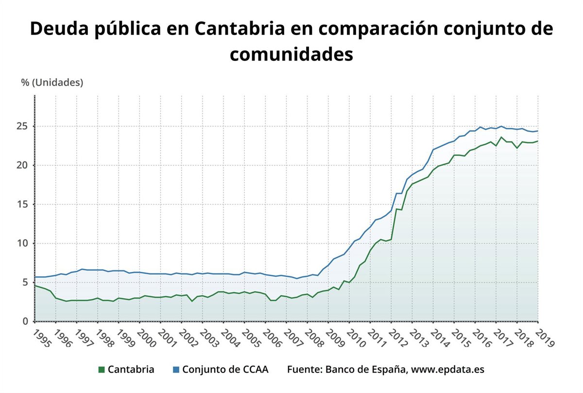 La deuda pública de Cantabria ha alcanzado en el primer trimestre de 2019 un total de 3.220 millones de euros, lo que supone el 23,1 por ciento del Producto Interior Bruto (PIB), cifra inferior a la media de las comunidades autónomas, que llegó al 24,4 por ciento, según los últimos datos publicados por el Banco de España.