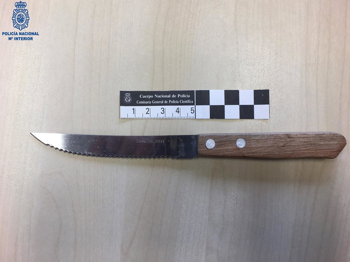 Momentos más tarde, los agentes del Grupo de Atención al Ciudadano (G.A.C) localizaron en la dirección facilitada una pareja, llevando la mujer en la mano asida una chaqueta de color rosa. Ante las evidencias, los policías procedieron a la identificación de ambos. Cuando realizaban el pertinente cacheo de seguridad, detectaron en el interior del bolso de la mujer un cuchillo.
