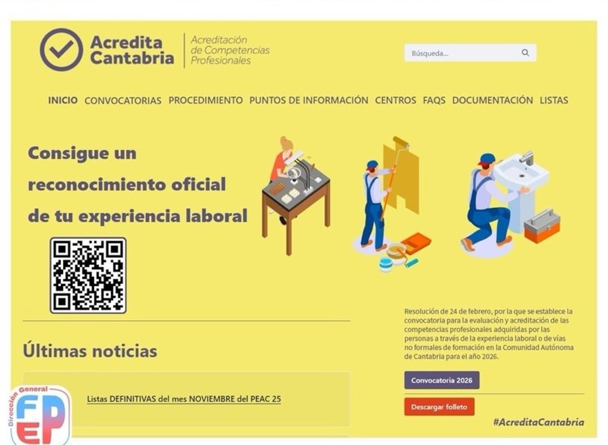 La Consejería de Educación, Formación Profesional y Universidades ha publicado la convocatoria de 2026 para evaluar y acreditar competencias profesionales adquiridas a través de la experiencia laboral o de vías no formales de formación en Cantabria, que este año persigue el objetivo de acreditar 3.000 estándares entre las más de 1.100 referencias del Catálogo de Estándares de Competencias Profesionales de la región.
