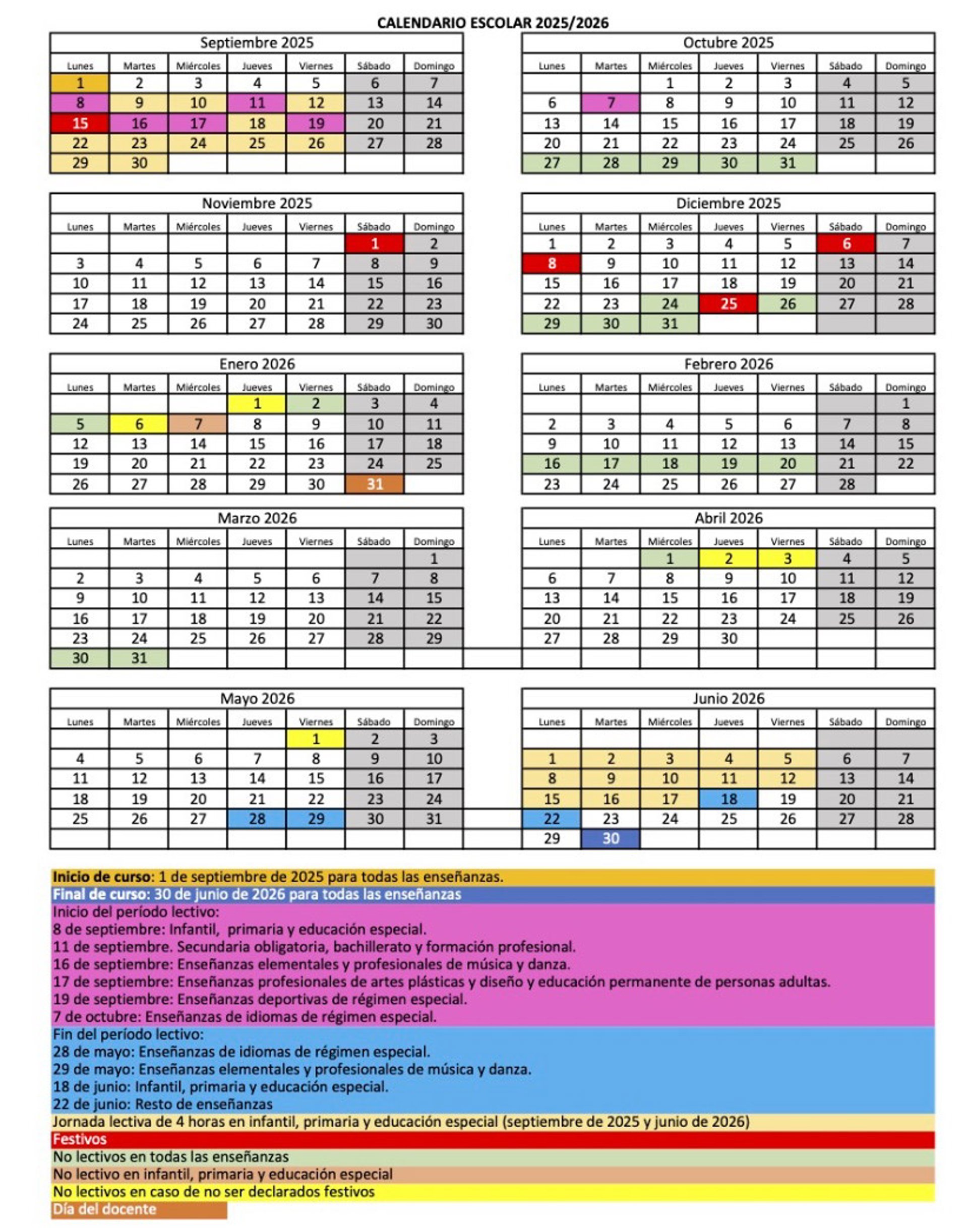En educación infantil y educación primaria, y en los centros de educación especial, las actividades lectivas se desarrollarán desde el 8 de septiembre de 2025 hasta el 18 de junio de 2026, ambos inclusive.