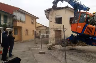 El alcalde de Torrelavega, José Manuel Cruz Viadero; el primer teniente de alcalde, Javier López Estrada; y el concejal de Urbanismo, José Otto Oyarbide; han asistido este lunes al inicio de la demolición de las dos viviendas situadas junto a los talleres municipales de Campuzano que va a permitir la liberalización del suelo necesario para la construcción de 20 viviendas sociales en régimen de alquiler social en una parcela de 5.000 metros cuadrados, en la que se incluyen los actuales talleres municipales.