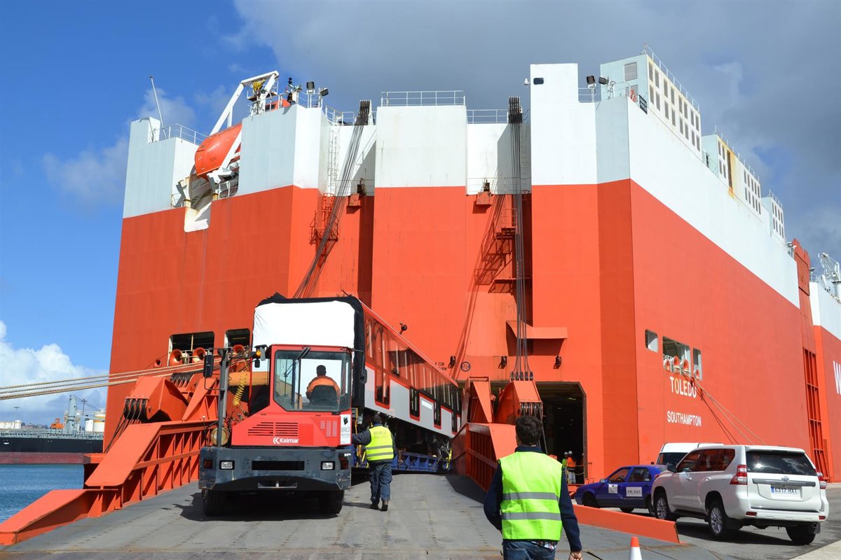 El Puerto de Santander ha side testigo este jueves del primer embarque de cinco vagones de metro con destino a San Antonio (Chile) a bordo del buque 'Toledo', operado por la naviera Wallenius Wilhelmsen Logistics.