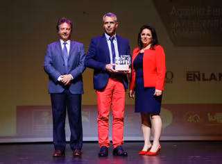 El Premio al Emprendedor es para Sierra del Oso y para su fundador y propietario, Ángel Moreno, que subió al escenario acompañado de su hijo, Manuel Moreno. Además de seguir con la tradición familiar en la elaboración de orujo, Ángel Moreno amplió horizontes con vinos, licores y destilados. Pero su gran hazaña más reciente ha sido abancalar en los dos últimos años una ladera en la que ha plantado más de 4.000 viñas con la idea de fortalecer el sector vitivinícola en la comarca de Liébana.
