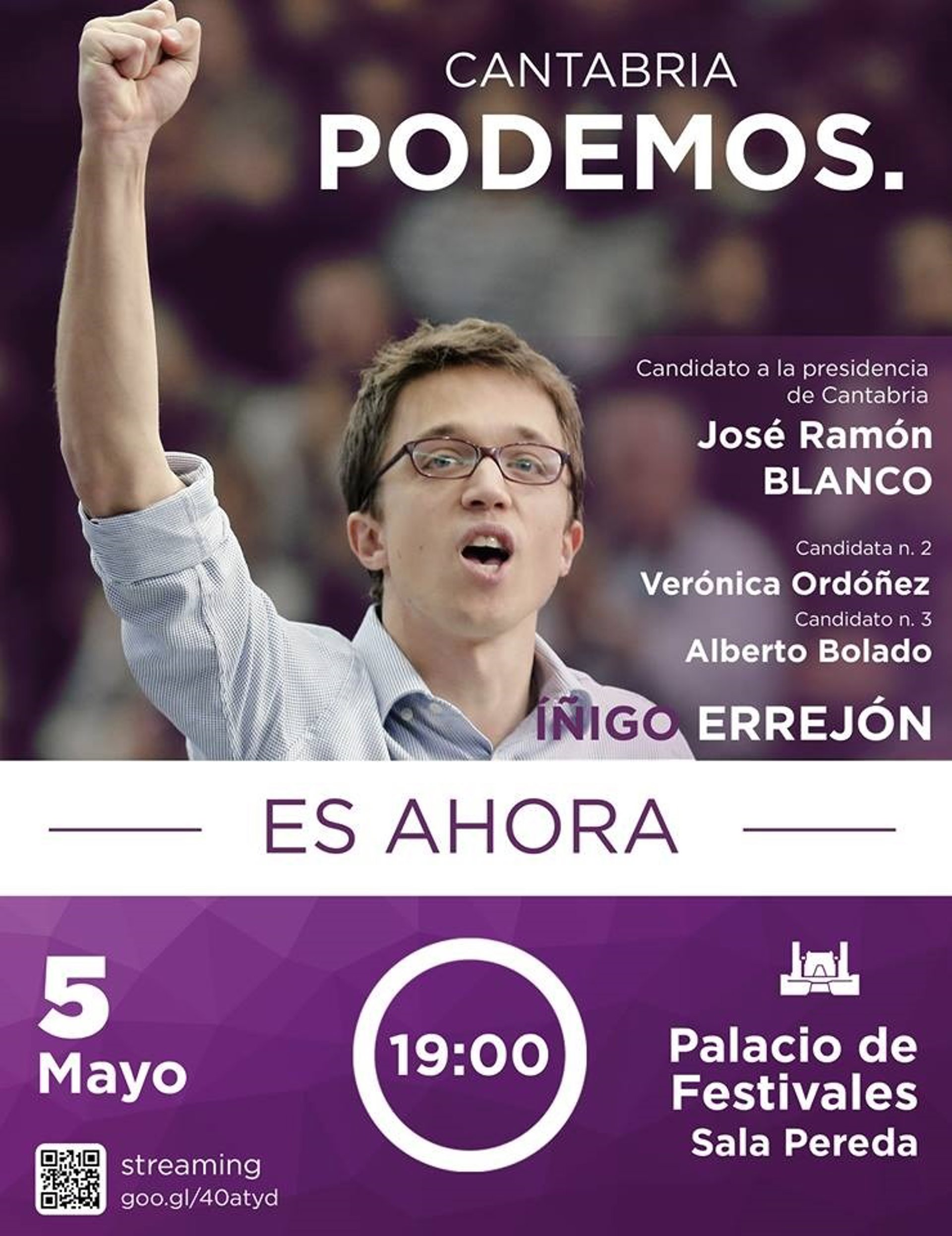 Junto a Errejón y Blanco, que es secretario general de Podemos Cantabria, estarán en este acto, que se celebra bajo el lema 'Es ahora', los números 2 y 3 de la candidatura, Verónica Ordoñez y Alberto Bolado, respectivamente.