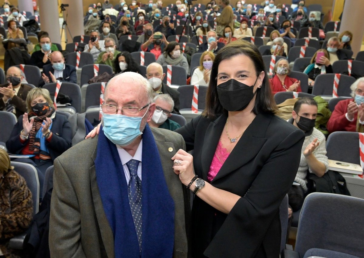 La alcaldesa de Santander, Gema Igual, impone al escritorio Luis de Escallada, la insignia con la Estela de Oro de las Letras de Cantabria durante un acto celebrado en el Ateneo por el Día de las Letras - AYUNTAMIENTO DE SANTANDER