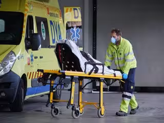 Miembros de una ambulancia del DYA Navarra procede al traslado de un paciente en el Complejo Hospitalario de Navarra durante a Pandemia Covid-19 en Abril 28, 2020 en Pamplona, Navarra, España - Eduardo Sanz / Europa Press