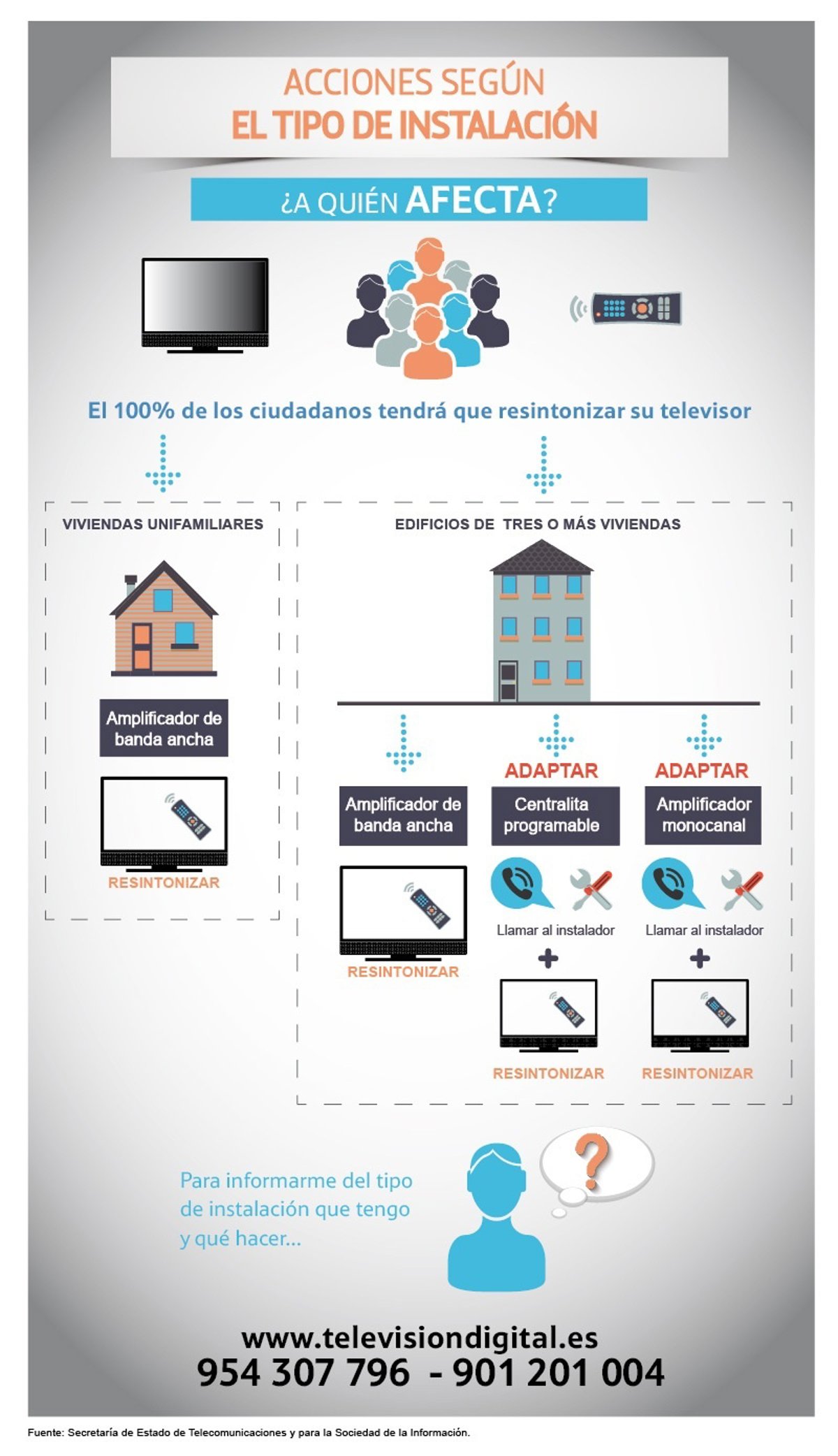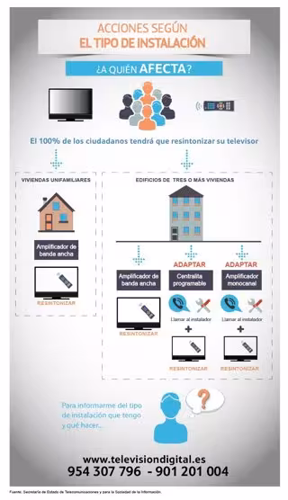 Se han habilitado los teléfonos 901 20 10 04 y 954 30 77 96 para resolver cualquier duda. Asimismo, en la página web www.televisiondigital.es se puede encontrar toda la información sobre el proceso y sobre las actuaciones específicas a realizar en su vivienda de acuerdo a su ubicación geográfica.