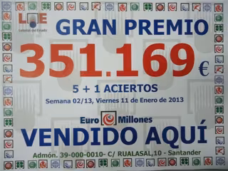 El sorteo de la lotería europea 'Euromillones' de este viernes, 11 de enero, ha dejando en Santander un premio de 351.169,56 euros. El boleto acertante, de segunda categoría (5+1), se validó en la administración de loterías número 10, en la calle Rualasal de la capital cántabra, regentada por Iris Martín Bolado.