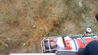 En el descenso, rescatador y médico han constatado la imposibilidad de hacer llegar a tierra la camilla por el abundante arbolado de la cuenca del río.