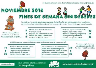 En cuanto a la campaña en sí, lo que se plantea es que las asociaciones de padres y madres de alumnos soliciten a los centros educativos que durante los fines de semana de este mes no se pongan deberes para hacer en casa, mientras que se anima a las familias a no realizarlos, sustituyéndoles por recuperar o aumentar el tiempo compartido entre padres e hijos.