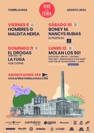 El festival Vive la Feria de Torrelavega 2024, que se celebrará entre 9 y el 12 de agosto en el exterior de la Feria de Muestras de La Lechera, ha dado a conocer este miércoles el reparto definitivo de artistas en cada una de las jornadas y ha puesto a la venta las entradas de día.