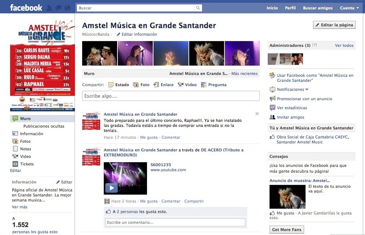 Los festivales de música Santander Music y Amstel Música en Grande lograron superar en su edición de 2011 los 4.500 seguidores en las redes sociales Facebook y Twitter.