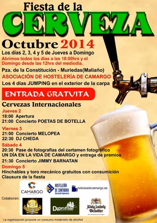 Camargo celebra desde este jueves, 2 de octubre, al domingo, día 5, su Fiesta de la Cerveza, que se desarrollará en el interior de una carpa de mil metros cuadrados instalada por el Ayuntamiento en la Plaza de la Constitución (Muriedas).