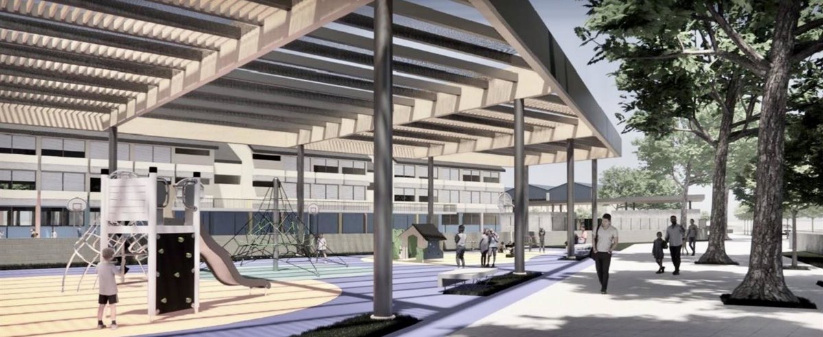El planteamiento contempla la ejecución de una marquesina que cubra el núcleo de comunicaciones que da acceso al aparcamiento, creando un espacio de sombra y cobijo, que servirá además como porche de entrada al CEIP Macías Picavea.