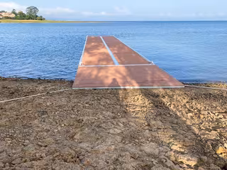Por otro lado, y debido a la gran variación del nivel del agua que presenta el pantano del Ebro, se ha previsto un sistema de fijación flexible que permita regular la situación del pantalán a través de cabos y muertos de hormigón alejados de tierra.