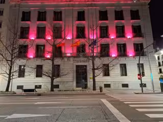 Desde la madrugada del jueves, la Delegación del Gobierno ha iluminado su fachada en color morado en señal de apoyo a las reivindicaciones del 8 de Marzo.
