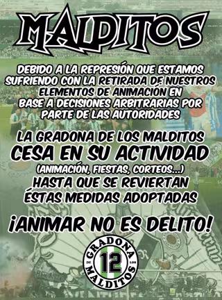 La Gradona de los Malditos del Racing de Santander ha anunciado la suspensión de toda actividad ante la "represión" que, según ha denunciado está sufriendo con la "reiterada" retirada de sus elementos de animación en base a "decisiones arbitrarias por parte de las autoridades".