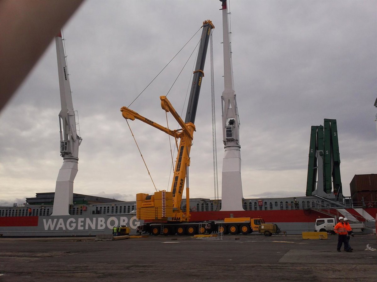 La grúa con la que se está realizando la carga en el Aragonborg, de enormes dimensiones, solo ha sido superada en potencia por la instalada para la construcción de la rampa de Raos-8, según ha informado el Puerto de Santander en nota de prensa.