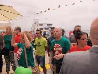El grupo siguió a De la Serna y al equipo de Gobierno por las casetas del paseo marítimo, coreando frases como 'Menos fiestas y más vivienda social' cuando pararon a comer un pincho.