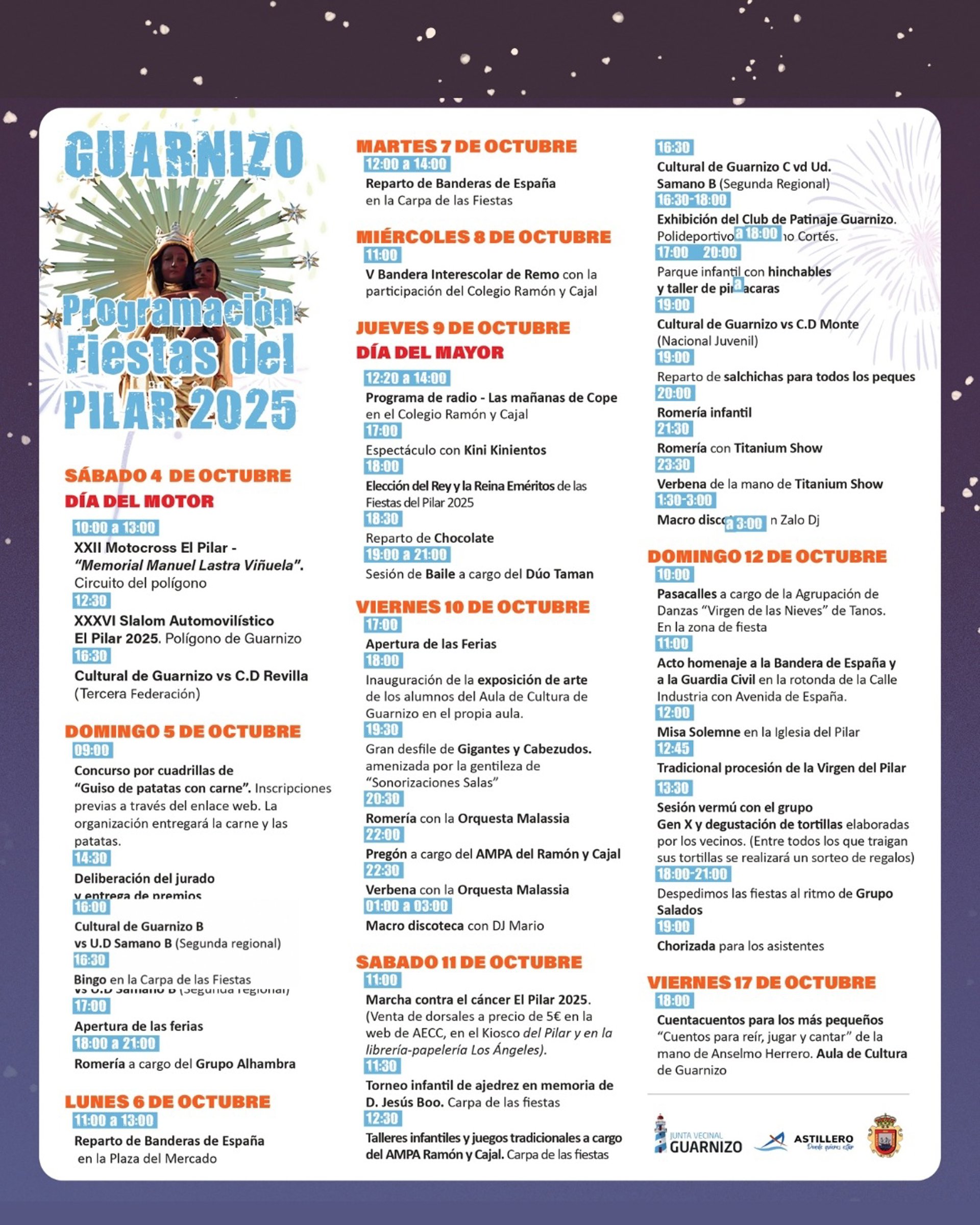 La localidad de Guarnizo, en Astillero, abre su calendario festivo de octubre con una propuesta renovada que combina deporte del motor, gastronomía popular, actividades familiares y los actos en honor a la Virgen del Pilar. Las celebraciones se desarrollarán del 4 al 12 de octubre, con una última cita cultural el viernes 17.