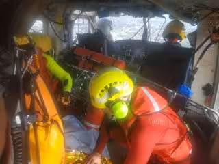 El rescatador de grúa se aproximó nadando y tras analizar la situación le estrobó en el arnés de rescate para subirle al helicóptero en doble izado.
