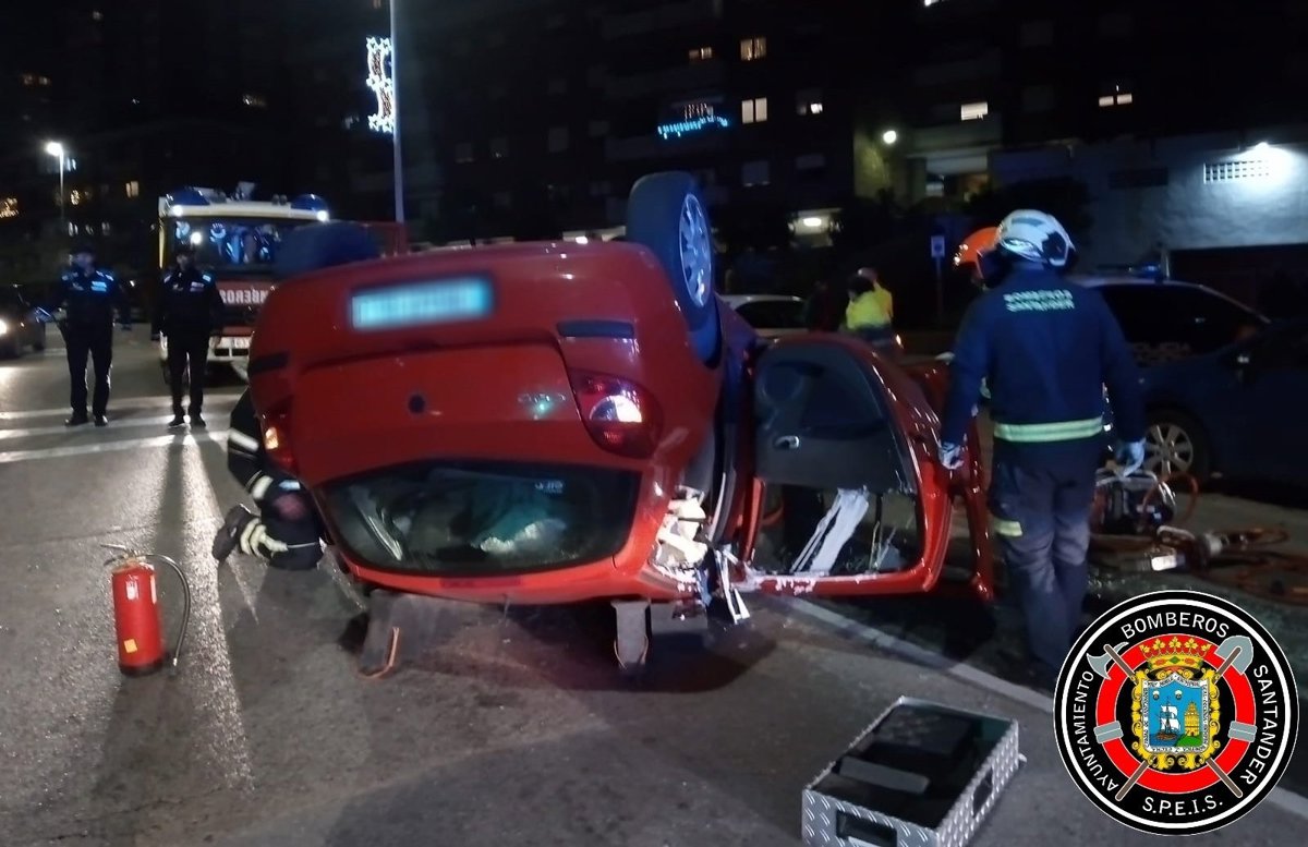El conductor de un turismo ha resultado herido anoche al volcar su vehículo tras chocar contra otro coche que estaba aparcado en la calle Torres Quevedo de Santander.