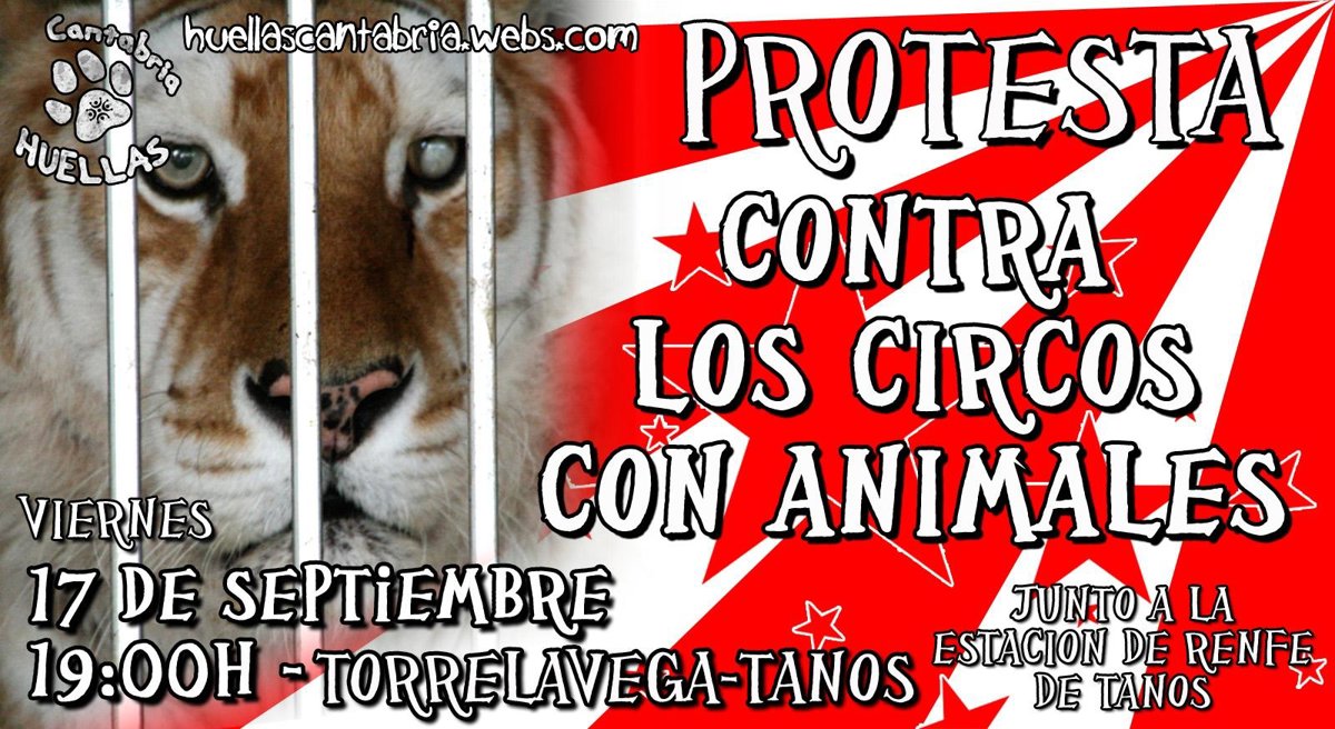 La asociación de defensa de los derechos de los animales Huellas Cantabria ha convocado para este viernes, 17 de septiembre, un acto de protesta en Torrelavega, contra los circos que usan animales en sus espectáculos.