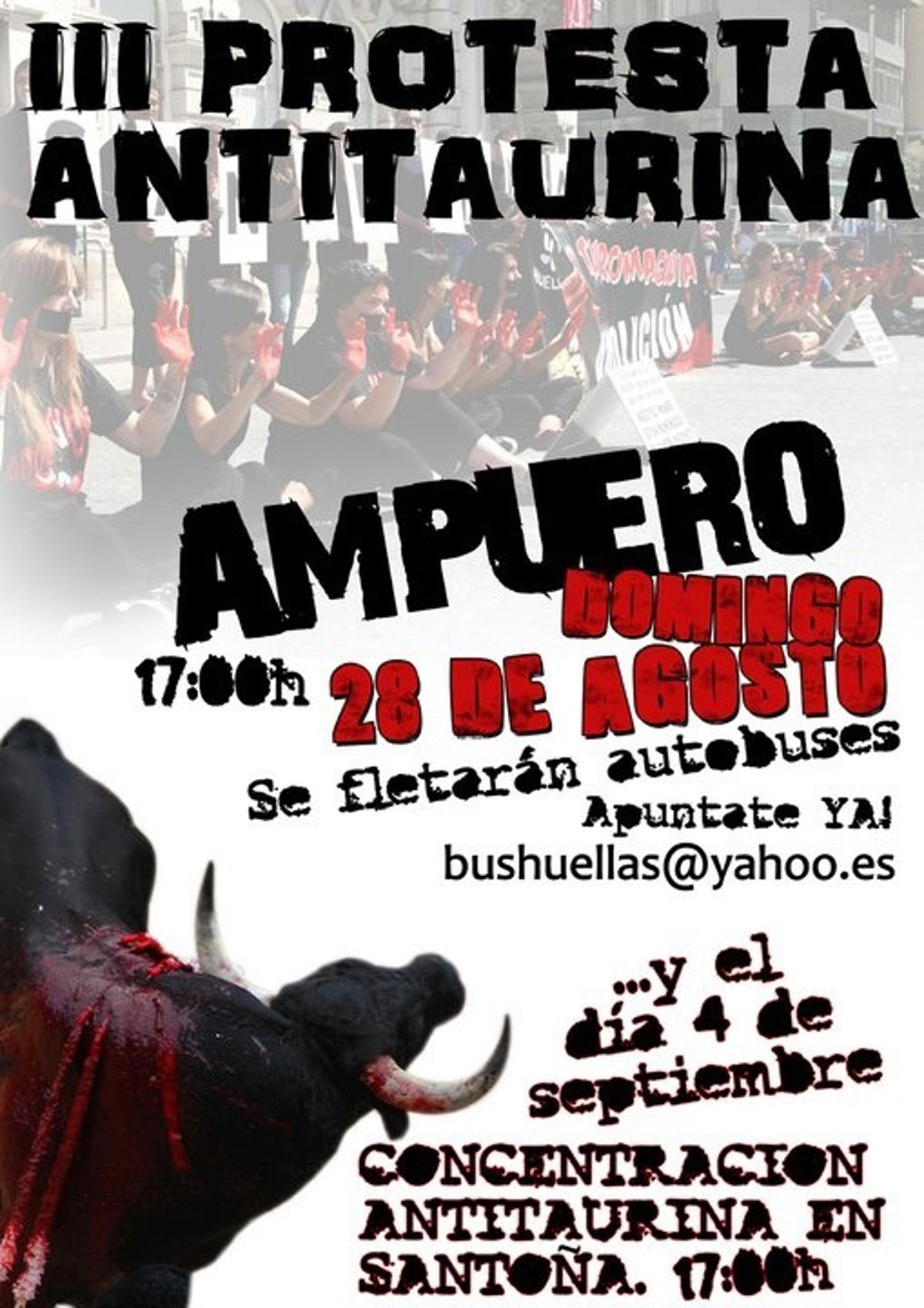 La asociación de defensa de los animales Huellas Cantabria llevará a cabo este domingo, día 28, por tercer año, una 'perfomance' antitaurina en Ampuero, en protesta por los encierros y corridas que se organizan en la localidad con motivo de sus fiestas, actividades que son, a su juicio, "de explotación y maltrato a los animales".